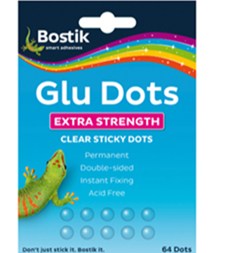 Clear adhesive dots which stick to almost anything including paper, wood, plastic, metal, glass and painted surfaces.