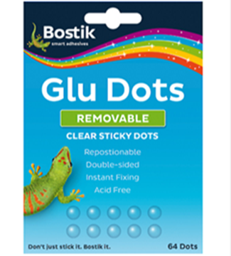 Clear adhesive dots which stick to almost anything including paper, wood, plastic, metal, glass and painted surfaces.